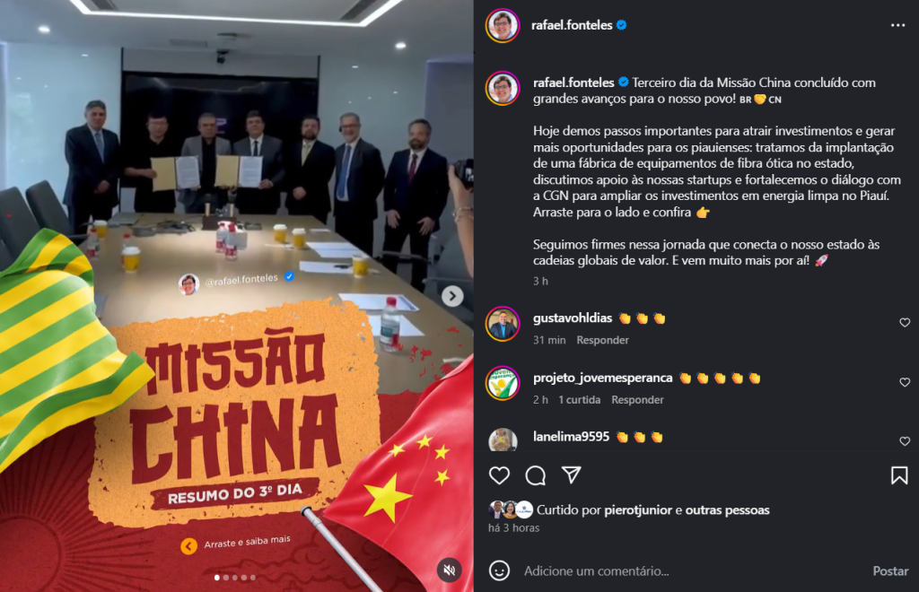 Em Shenzhen, a parceria entre C-Data e Ora Telecom marcou o início da instalação de uma fábrica de equipamentos de fibra óptica no Piauí. Já em Shanghai, a agenda prevê encontros com o Novo Banco de Desenvolvimento (NDB), dos BRICS, e com multinacionais da área de energia renovável. A missão será concluída na Alemanha, com reuniões no Ministério da Economia e Ação Climática e na Embaixada Brasileira.
